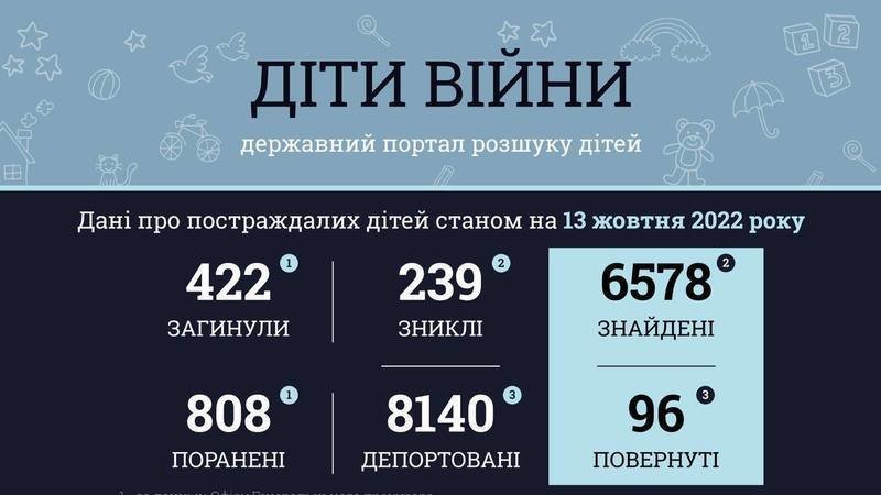 Більше ніж 1230 дітей постраждали в Україні внаслідок повномасштабної збройної агресії Російської Федерації. Станом на ранок 13 жовтня 2022 року офіційне число дітей-жертв за добу не змінилося - 422. Не зазнали змін і дані щодо поранених - 808.