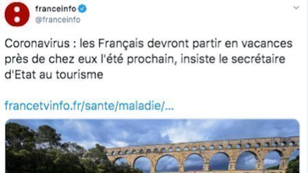 Hier le secrétaire d'Etat au tourisme, Jean-Gabriel Lemoyne a déclaré que les Français devront partir en vacances près de chez eux l'été prochain. Le site de franceinfo a cité ces propos avec une image du Pont du Gard. C'est bienvenu, mais nous ne voulons pas d'Amazon qui va défigurer les alentours du site classé Grand Site de France et classé au Patrimoine mondial de l'Unesco!