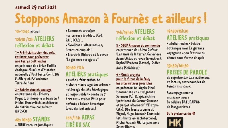 Un petit rappel: demain samedi 29 mai (10h-17h) a lieu à Fournès (sortie 23 de l'A9, Rémoulins) (Gard) un nouveau rassemblement citoyen contre le projet d'implantation d'Amazon sur place . Venez nombreux!