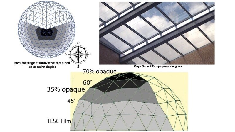 The Biodome’s south face will showcase gradated transparent solar panels. Clear ones up to 45° will let in low angle winter sun. Above 45° the springtime sun gets partly absorbed by the 35% opaque solar panels. Above 60° the 70% opaque panels absorb the summer sun's heat and intensity for more electricity.