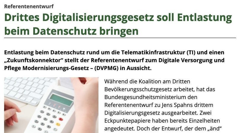 Entlastung beim Datenschutz rund um die Telematikinfrastruktur (TI) und einen „Zukunftskonnektor“ stellt der Referentenentwurf zum Digitale Versorgung und Pflege Modernisierungs-Gesetz – (DVPMG) in Aussicht.