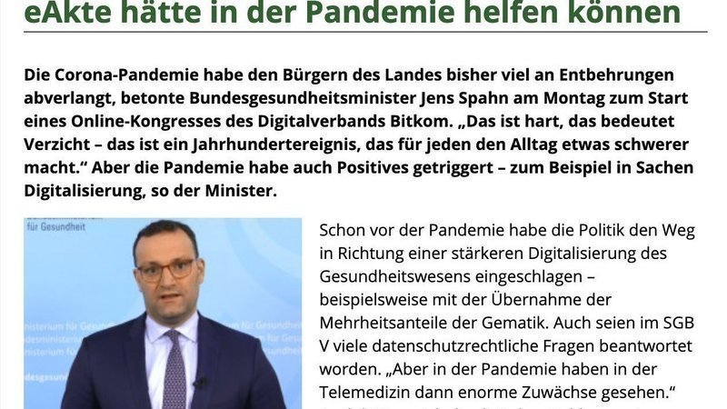 "Schon vor der Pandemie habe die Politik den Weg in Richtung einer stärkeren Digitalisierung des Gesundheitswesens eingeschlagen – beispielsweise mit der Übernahme der Mehrheitsanteile der Gematik. Auch seien im SGB V viele datenschutzrechtliche Fragen beantwortet worden. „Aber in der Pandemie haben in der Telemedizin dann enorme Zuwächse gesehen.“ Auch hätten sich die digitalen Meldewege im öffentlichen Gesundheitsdienst innerhalb von drei Monaten so schnell weiterentwickelt, wie in den ganzen zehn Jahren davor nicht. „Es gibt zwar noch die Labormeldung per Fax – aber auch das wird sich noch verbessern“, so Spahn.