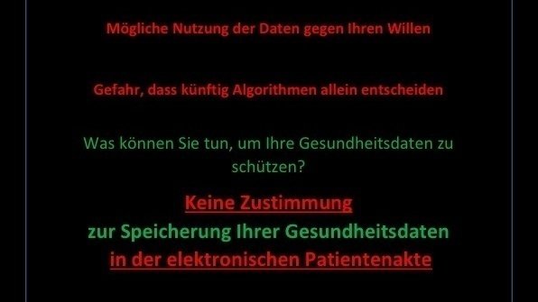 Mit der elektronischen Patientenakte- ePA - sollen Ihre Gesundheitsdaten auf zentralen Servern gespeichert werden. Verschiedene Personen und Institutionen haben Zugriff. Cyberattacken und Hackerangriffe sind nicht auszuschließen. Deshalb bestehen gegen die zentrale Speicherung gravierende Bedenken, die die Vorteile überwiegen.