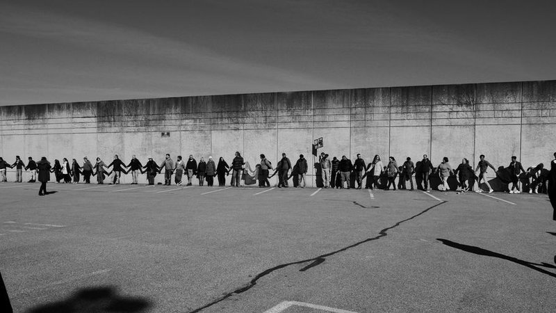 Und so habe ich ein Schwarzweißbild ausgesucht (Dank an Stefan Heusterberg), das unsere Menschenkette um das Abschiebegefängnis in Mühldorf zeigt. Über 400 Menschen umzingelten die Mauern und Wände der JVA - Hand in Hand gegen die Abschiebungen - und stellten sich so vor die Schutzsuchenden. Leider nur symbolisch.