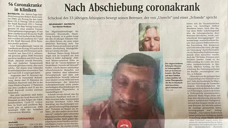 Die Notwendigkeit für ein Abschiebemoratorium in der Pandemie wird durch einen tragischen Fall mehr als deutlich. Ein 33jähriger schwerst traumatisierter Äthiopier wurde auf dem Abschiebeflug mit Covid-19 infiziert, musste stationär in Addis Abeba behandelt werden (s. Foto: Artikel aus dem "Nordbayerischen Kurier" 10./11.4.21). So etwas wollen wir nie wieder lesen! Zum Glück hat Hussen E. überlebt.