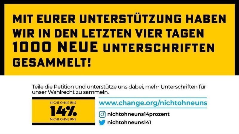 wir brauchen noch eure Unterstützung! Hier sind paar Vorschläge, wie ihr uns unterstützen könnt. Wir sind aber auch offen für neuen Ideen. Hast du einen anderen Vorschlag? Schreib uns gerne eine DM auf Instagram oder Twitter oder schick eine Email an: nichtohneuns14prozent@gmail.com