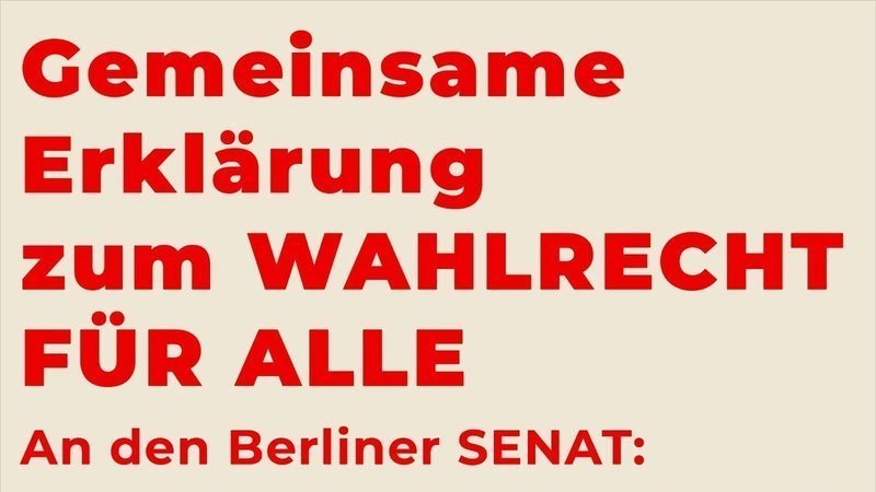 Wir appellieren an die rot-rot-grüne Landesregierung: Ob Volksentscheid, Abgeordnetenhaus oder Bundestag - Wahlrecht muss für alle gelten! Dafür muss die neue Regierung sich jetzt mit allen Mitteln einsetzen - alles andere ist undemokratisch!