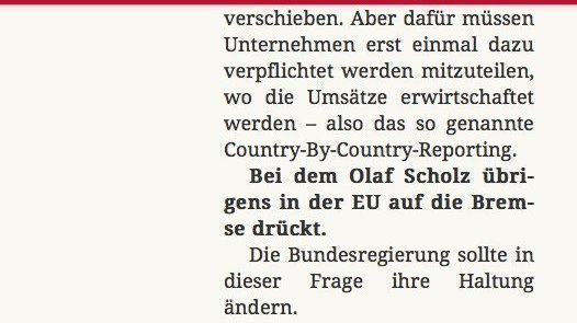 schon über 88.000 Unterzeichner unterstützen meine Forderung, dass die Bundesregierung die Steuertransparenz von Großunternehmen in Brüssel nicht länger blockieren darf. Danke dafür!!! Nun haben wir gewichtige Unterstützung bekommen: Der ehemalige NRW-Finanzminister und Anti-Steuerflucht-Kämpfer Norbert Walter-Borjans von der SPD hat in einem aktuellen Interview in der taz, die SPD öffentlich aufgefordert, ihre Position bei der öffentlichen Steuertransparenz von Großunternehmen zu ändern. Er unterstützt uns dabei mutig gegen den SPD-Finanzminister Olaf Scholz. Hier in ganzer Schönheit nachzulesen: www.taz.de/!5546242/