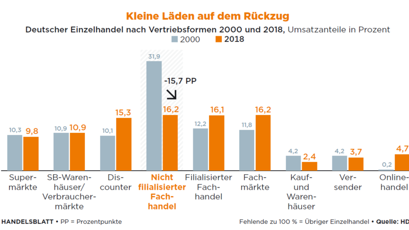 Wie das Handelsblatt unter Berufung auf Zahlen des Hauptverbandes des Einzelhandels berichtet, hat sich die Zahl des “nicht-filialisierten Fachhandels”, also vor allem kleine Läden wie der Bäcker im Ort, seit dem Jahr 2000 nahezu halbiert. Gleichzeitig ist der Anteil großer Ketten und des Online-Handels stark gewachsen. Diese Entwicklung führt zu einer reduzierten Vielfalt der Geschäfte und trägt zur Verödung der Innenstädte bei. Zusätzliche Wertschöpfung und Arbeitsplätze fließen aus unseren Regionen ab. Wie die neuen Zahlen zeigen, sind besonders die Bundesländer Thüringen, Sachsen-Anhalt und Mecklenburg-Vorpommern davon betroffen.