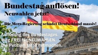 Das Ziel dieser Petition ist, dass Bundespräsident Steinmeier den Bundestag auf Vorschlag von Bundeskanzler Friedrich Merz vorzeitig auflöst, damit der Weg für Neuwahlen frei wird.
