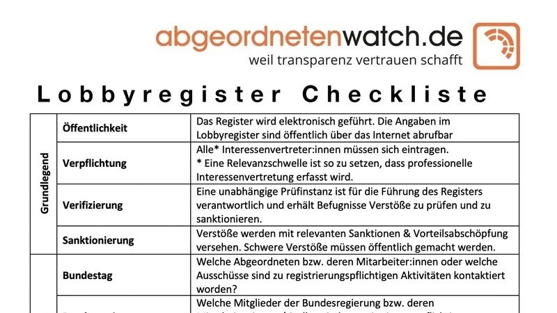 Noch ist nichts entschieden. Doch große Gefahr: Eine halbgare Lösung, die am Ende kaum Verbesserung bringt. Daher haben wir eine Checkliste erstellt, was ein Lobbyregister unbedingt enthalten muss!