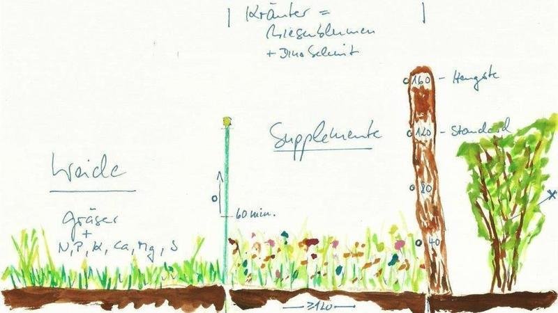 Es gilt hierbei zu beachten, dass eine Supplementierung der Pferde durch Kräuter=Wiesenblumen höhere Bioverfügbarkeit aufweist, als Mineralfutter UND zugleich Heimat und Nahrung z.B. für die gebeutelten Bienen darstellt. Im Gegensatz zum subventionierten Blühstreifen wird hier nicht gemulcht. Der außenliegende Busch ist auf Grund des Lichtbedarfes der Kräuter nur vereinzelt einzusetzen.