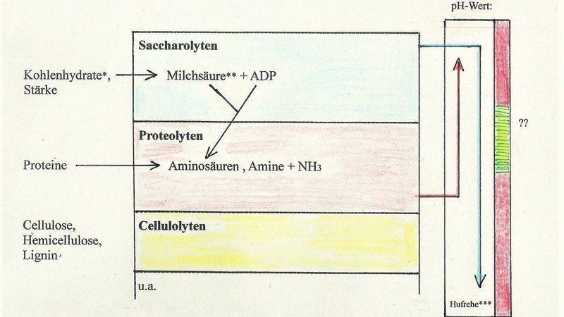 *Jede Verschiebung dieser Zusammenstellung und eine daraus resultierende pH-Wert-Veränderung, führt unweigerlich zu Problemen, die auch in Hufrehe münden können.