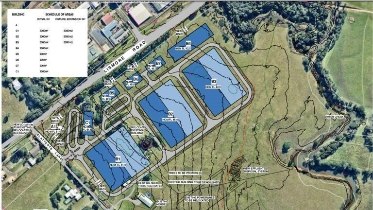 The attached picture is just the beginning of this massive industrial factory development proposed for 201 Lismore Road. The proposed DA states doubling the size which means double the traffic in terms of trucks and vehicles. Byron Creek runs at the back of the site this creek meanders through Bangalow and has a platypus population that could be threatened by this development. The existing non intrusive industrial estate can be seen across the road. SAY NO to this massive development which is in the wrong site and just too big in proportion to our unique village. They state it will be more jobs for Bangalow but in their own DA it says the majority of jobs will come from Lismore, Casino and Kyogle. They also are working off a environmental angle but it is on farmland, building a factory on our significant farmland is wrong on all counts. Traffic will go along a roads that koalas are seen on this is not an environmental plus for Bangalow. It is a disaster.