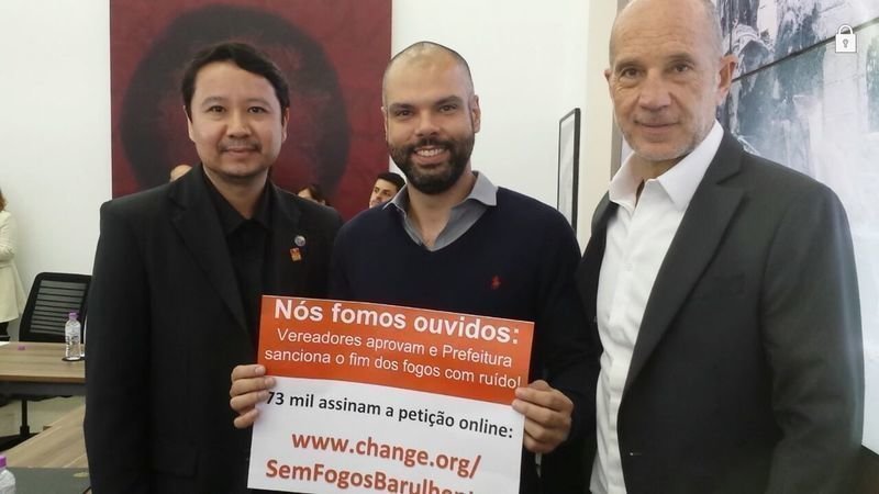 Queridos apoiadores, estou muito feliz! Essa é uma vitória da população, das crianças autistas, dos animais e todas as pessoas que sofrem com fogos com ruído. Dia 23/05/2018, o prefeito Bruno Covas sancionou a lei que proíbe o uso de rojões e outros fogos de artifício com estouro na cidade de São Paulo.