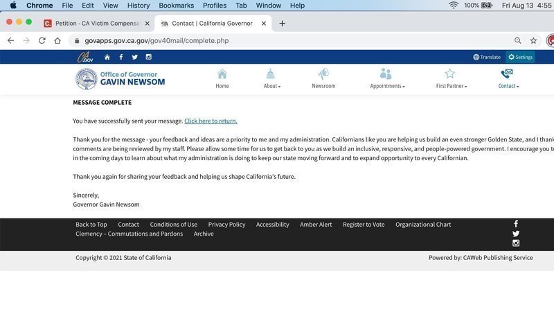 Keep the signatures coming, write a support statement to encourage Paul to hang in there until we announce Victory, so he can start the healing process. Minutes ago, we submitted the contact form for CA Governor Gavin Newsom to intervene. CalVCB is under Governor Newsom's jurisdiction and that management team has ignored our ad your voices - 391 that signed the petition and counting! The 9,109 are also interested in the outcome. Sign and share widely. More votes, more power to push abusers of powers to do the job right.