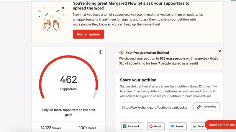 Hi all, I just wanted to reach out to let you know we’ve just passed 462 signatures on our petition! Thank you so much for your support! Will you help me to get more support by sharing this petition with ten other people? If enough of us sign we can’t be ignored! Here’s a link to share https://www.change.org/p/ca-victim-compensation-board-help-paul-gackle-heal-and-survive-reimburse-his-wage-loss