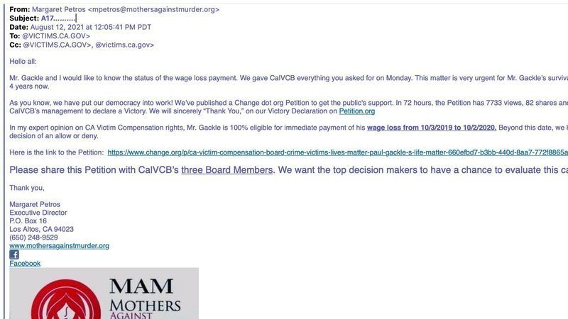 Thanks for your signatures, shares and views. I believe Paul Gackle will be helped by CA Victim Compensation Board (CalVCB) ....he has to be. He's 100% eligible for wage loss reimbursement. He was told he's eligible. The question is why is CalVCB still silent? At 500 signatures, Change dot org notified the ultimate decision makers, CalVCB Members: