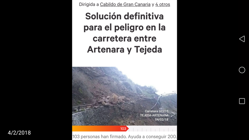 Neuigkeit zur PetitionSolución definitiva para el peligro en la carretera entre Artenara y TejedaMás de 100 personas apoyan la petición para una solución definitiva