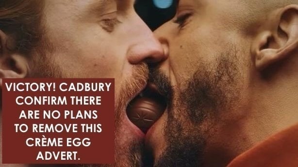 Petition updateDO NOT CANCEL The Cadbury's Creme Egg Advert With Two Men Kissing - In Fact Amplify It!Victory! Cadbury Confirm There Are NO PLANS To Remove The Ad With Two Men Sharing A Creme Egg!