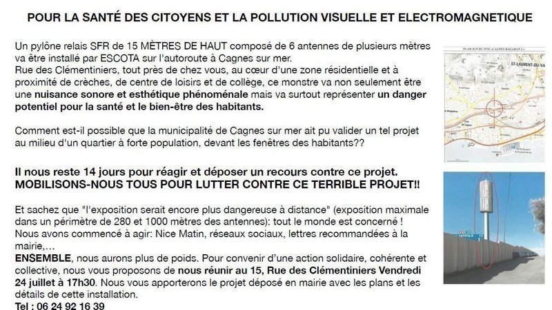 Mise à jour sur la pétitionCagnoises, Cagnois, mobilisons nous et luttons contre le Linky à Cagnes sur MerUne Antenne Relais de 15 mètres pour arroser Cagnes sur Mer