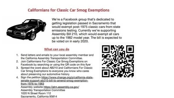Petition updateSupport AB210, bill to amend smog exemption from 1976 to 1983Thank you! Let’s keep up the good work!