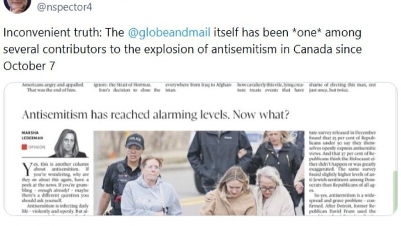 "Inconvenient truth: The @globeandmail itself has been *one* among several contributors to the explosion of antisemitism in Canada since October 7" | @nspector4