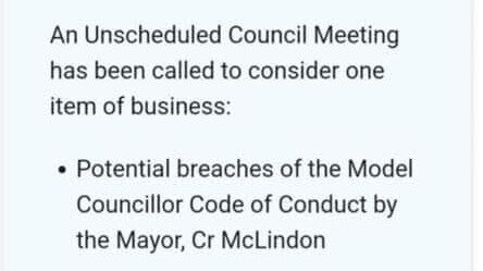 As per the attached image, council has called an unscheduled council meeting for potential breaches of the councillor code of conduct.