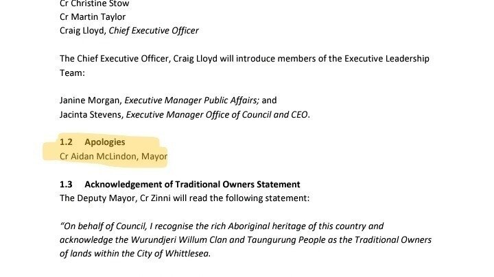So our Mayor can't even attend the meeting that's been called for his behaviour. Must be too busy down in Werribee!