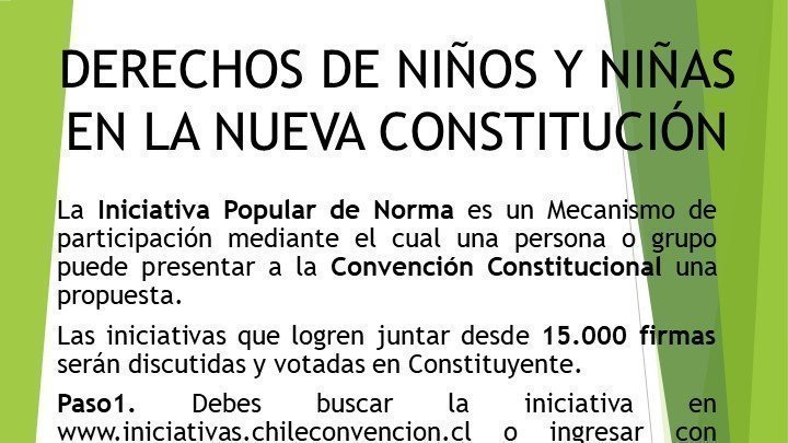 Necesitamos tu ayuda para poder juntar las firmas para incluir los Derechos de los Niños en la Nueva Constitución a través del mecanismo de participación ciudadana https://plataforma.chileconvencion.cl/m/iniciativa_popular/o/1586 Plazo hasta el 1 de febrero del 2022, por favor firmar y difundir