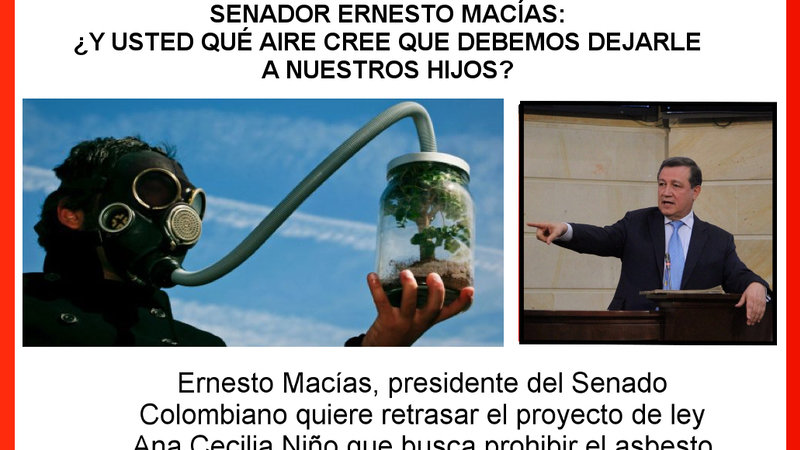 Al parecer al senador Ernesto Macías Tovar, presidente del Senado Colombiano no le interesa darle paso a la discusión del proyecto de ley #AnaCeciliaNiño que busca prohibir el uso del asbesto en nuestro país. Si no se trata pronto lo más probable es no se discuta este año ya que en pocos días se radicarán iniciativas de largo debate como la ley de financiamiento, lo cual ocuparía la agenda de las discusiones en los próximos meses.