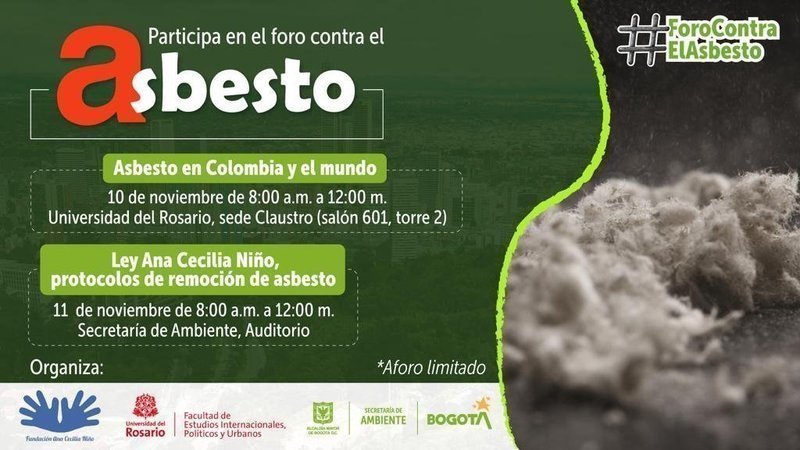 El foro CONTRA EL ASBESTO se desarrollará los días 10 y 11 de noviembre de 8:30 a.m. a 12 m. El primer día en la Universidad del Rosario y el segundo día en la Sectretaría Distrital de Ambiente.