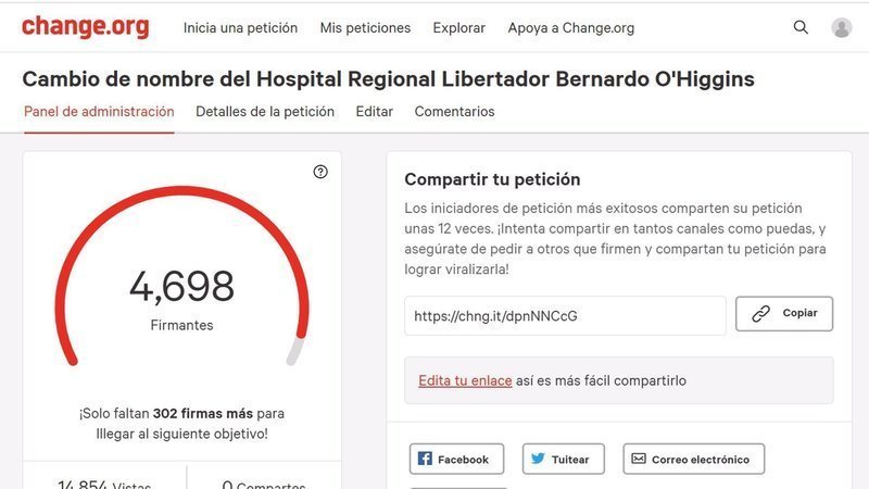 署名活動についてのお知らせCambio de nombre del Hospital Regional Libertador Bernardo O'HigginsFalta poco para las 5.000 firmas