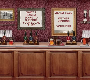 CAMRA gives away £20 worth of 50p off a pint vouchers that encourage members to visit Wetherspoons pubs 40 times a year. This will reduce the revenue of other pubs, sometimes compromising their viability.