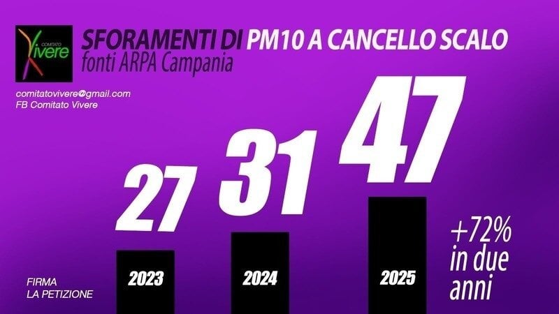 L’ARPAC ha certificato che, al 31 dicembre 2025, i limiti di PM10, sostanza altamente nociva per la salute, rilevati dalla centralina ubicata a Cancello Scalo sono stati superati per 47 giorni, a fronte di un limite massimo consentito dalla legge pari a 35 sforamenti annui. Il dato risulta ancora più allarmante se confrontato con gli anni precedenti: 31 sforamenti nel 2024 e 27 nel 2023. La progressione è evidente e preoccupante.