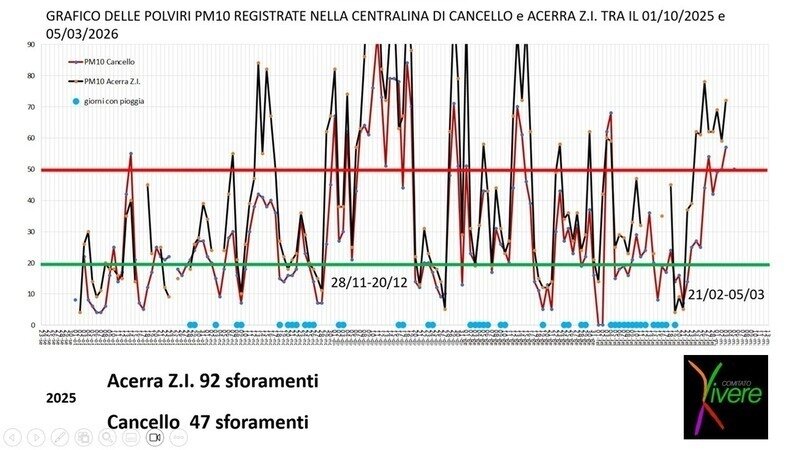 Dai dati presentati è emerso chiaramente come l’andamento dell’inquinamento da polveri sottili registrato ad Acerra e a Cancello Scalo sia strettamente collegato alle stesse cause (vedi grafico).