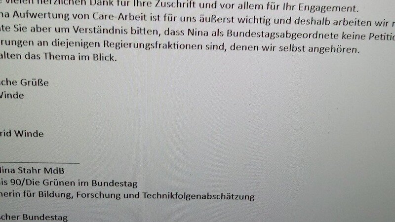Petition updateCare-Arbeit muss endlich einen Wert (Preis) bekommen - now or never!!Entscheidungsträgerin hat geantwortet