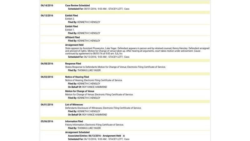 Hi folks. I was ill and not able to make it to the June 13th court appearance, but I was told by a supporter who attended that Hammond was given a change of venue to Johnson County. Missouri Case Net does not reflect that, but does show another court date in Cass County of 8-01-2016 at 9am in the courtroom of Judge Stacey Lett, for case review.