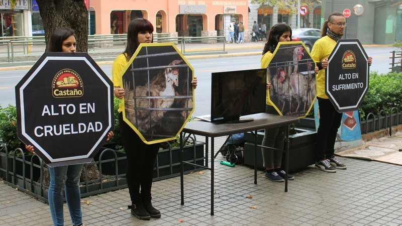 Con carteles y una televisión con imágenes de tristes gallinas víctimas de la industria del huevo le hicimos, nuevamente, este pedido de compasión por los animales a la empresa chilena.