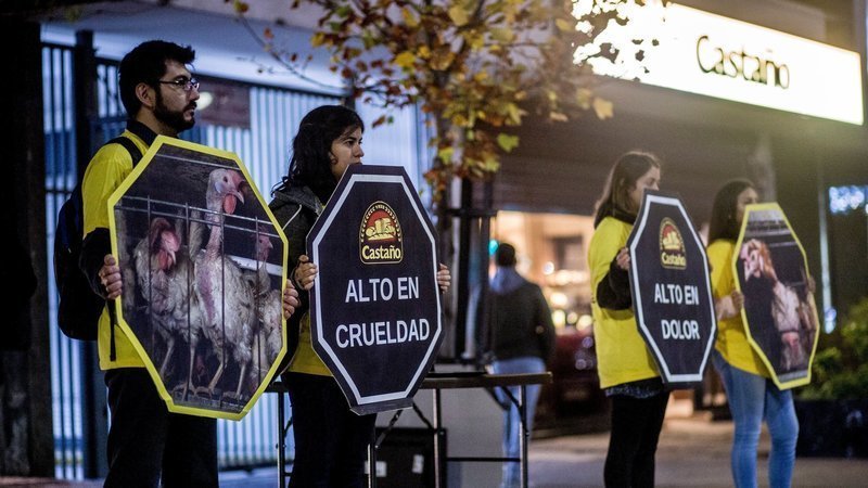 Activistas de Sinergia Animal protestaron una vez más fuera de un local de Castaño, en la comuna de Las Condes, pidiendo más compasión por los animales y exigiendo una política para no utilizar huevos de gallinas enjauladas en sus productos.