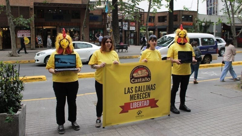 El jueves pasado realizamos una nueva acción frente a las oficinas de la empresa Castaño en el barrio Providencia, Santiago. Nos manifestamos con máscaras de gallinas y material audiovisual sobre las crueles jaulas donde se crían las gallinas en la industria del huevo para exponer la realidad de millones de animales en nuestro país.