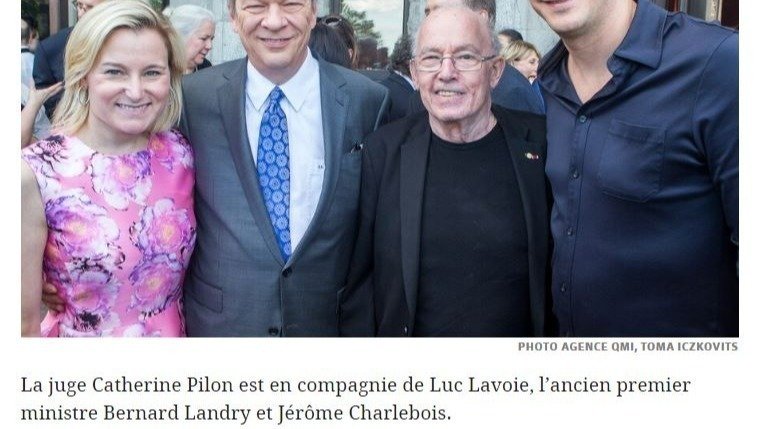 Catherine Pilon, shown in the photo above, stands not with other judges, but instead displays herself at a lavish party, consorting with an ex-premier of Quebec and other members of Quebec's elites with ties to a myriad of companies whose vested interests Canadian consumers may seek to challenge in future lawsuits.