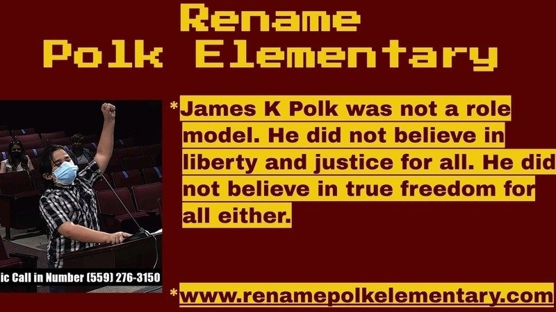 The board president, Richard Solis rsolis@centralunified.org (559)400-3754, proposed that only the Polk name, Kearney (a local racist), and the Native American logo be considered for change. He did not include the pioneers mascot, T. Roosevelt, J. Madison, and W. McKinley for consideration for change. He said that he wanted to give a win to those who oppose the name and mascot changes (he gave a bigger win to adults who bully children of color than to the children who are negatively impacted by these inappropriate school names and mascots). He also wants to implement a 15-year moratorium on school name and mascot changes.