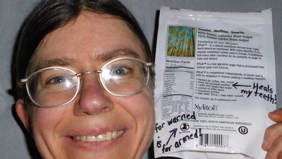 In the same spirit, I would like to see products containing sorbitol to also be required to contain a warning, indicating that sorbitol sweetener creates an oral environment that allows the dental bacteria that cause cavities to thrive. I learned this fact from Dr Elle's book, and was shocked to find out that it is the most common sweetener used in toothpastes, which is great for the manufacturers, because the more you use their toothpaste the more you will need to brush your teeth because you are creating a dental bacteria population explosion. It is also the most common sweetener used in sugar-free gums, but every time I use a product with sorbitol, I can tell immediately, even if it wasn't labeled, because the bad breath I had banished with xylitol comes roaring back. I find it so ironic that products sold to promote dental health can have a sweetener that feeds the health of dental bacteria, and most consumers know nothing of the side-effects of this cheap sweetener. I avoid sorbitol like the plague now.