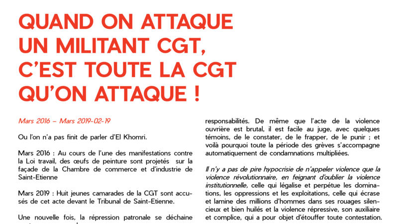 Mars 2019 : Huit jeunes camarades de la CGT sont accusés de cet acte devant le Tribunal de Saint-Etienne.