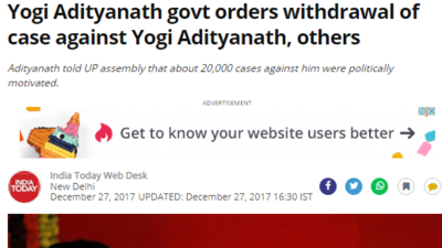 The Yogi Adityanath Government of Uttar Pradesh has been ordering cancellation of several criminal cases against himself and others. This is blatant misuse and abuse of power and gross violation of human rights. Many of the cases are related to rioting and communal violence which have instigated hatred and violence among the people. This is not the first time the Yogi Adityanath Government is withdrawing cases against himself and his accomplices. We, as the citizens of India, need to raise our voice against such criminal acts by the chief minister of state. This is the time to get united and raise our voice against such abuse of power.