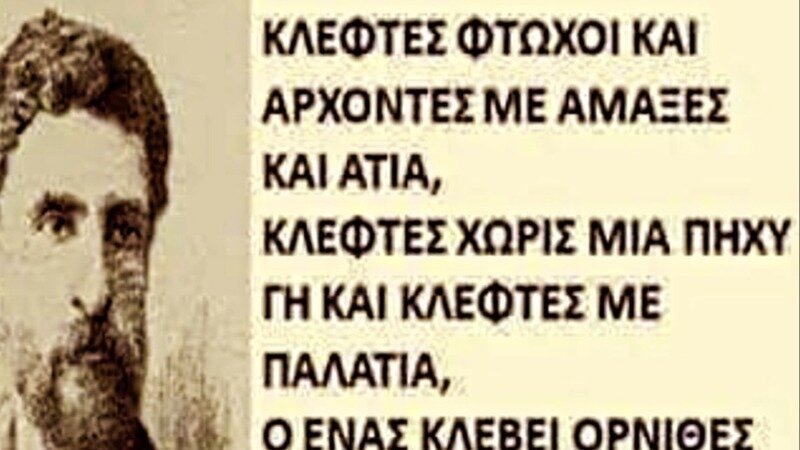 "ΚΛΕΦΤΕΣ ΦΤΩΧΟΙ ΚΑΙ ΑΡΧΟΝΤΕΣ ΜΕ ΑΜΑΞΕΣ ΚΑΙ ΑΤΙΑ, ΚΛΕΦΤΕΣ ΧΩΡΙΣ ΜΙΑ ΠΗΧΥ ΓΗ ΚΑΙ ΚΛΕΦΤΕΣ ΜΕ ΠΑΛΑΤΙΑ, Ο ΕΝΑΣ ΚΛΕΒΕΙ ΟΡΝΙΘΕΣ ΚΑΙ ΣΚΑΦΕΣ ΓΙΑ ΨΩΜΙ Ο ΑΛΛΟΣ ΤΟ ΕΘΝΟΣ ΣΥΣΣΩΜΟ ΓΙΑ ΠΛΟΥΤΗ ΚΑΙ ΤΙΜΗ..."