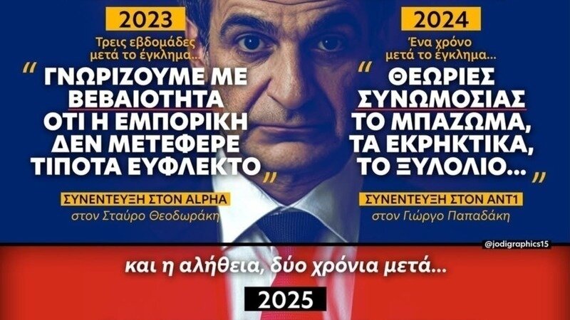 28 Φεβρουαρίου 2023. Οκτώ μέρες μετά. Δύο τρένα, ένα επιβατικό και μια εμπορική αμαξοστοιχία συγκρούονται μετωπικά κοντά στα Τέμπη, στη Λάρισα. Προκλήθηκε ο θάνατος 57 τουλάχιστον ανθρώπων κυρίως φοιτητών και τραυματισμός δεκάδων. Τρεις εβδομάδες μετά, σε συνέντευξη στον Σταύρο Θεοδωράκη (ALPHA), ο Πρωθυπουργός που μίλησε εξαρχής ΜΟΝΟ για ανθρώπινο λάθος, βάζει, με βεβαιότητα, τέλος σε φημολογούμενα σενάρια για ύπαρξη παράνομων έφλεκτων υλικών στο εμπορικό τρένο και αποδίδει την έκρηξη που ακολούθησε της σύγκρουσης σε ανάφλεξη των ελαίων σιλικόνης των μετασχηματιστών.