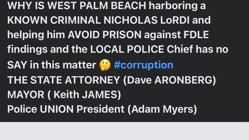 署名活動についてのお知らせCHARGE officers Nicholas Lordi and Jamesloo Charles of the West Palm Beach Police Dept.WEST PALM BEACH STATE ATTORNEY’S OFFICE VIOLATED VICTIMS RIGHTS LAW IN THE STATE OF FLORIDA