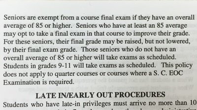 Charleston County School District changed the 2014-2015 exemption policy to having an 85 or higher and being a senior and having no other contributing factors. Today is January 6, 2016, 3 school days before exams and seniors, that qualify for the pilot exam policy, are now rushing to get prepared for an exam that was not supposed to be administered to us. Teachers as well as students are upset about this sudden change and wish to have the old pilot policy back. This is a conflict for the Wando community and all 15 schools in Charleston County School District. This sudden change affects families, students, teachers, and every person involved in education. This decision affects all 55,000 students in Charleston County School District.